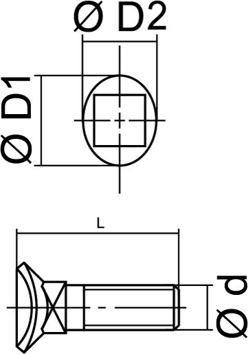 Oval head bolt, square neck to ISO 5713, grade 8.8 and 10.9. Supplied with nut in grade .8 to DIN934, DIN985 or in grade .10 to DIN 6927. Grade 8.8 has 800 (N/mm²) tensile strength and 640 (N/mm²) yield strength.